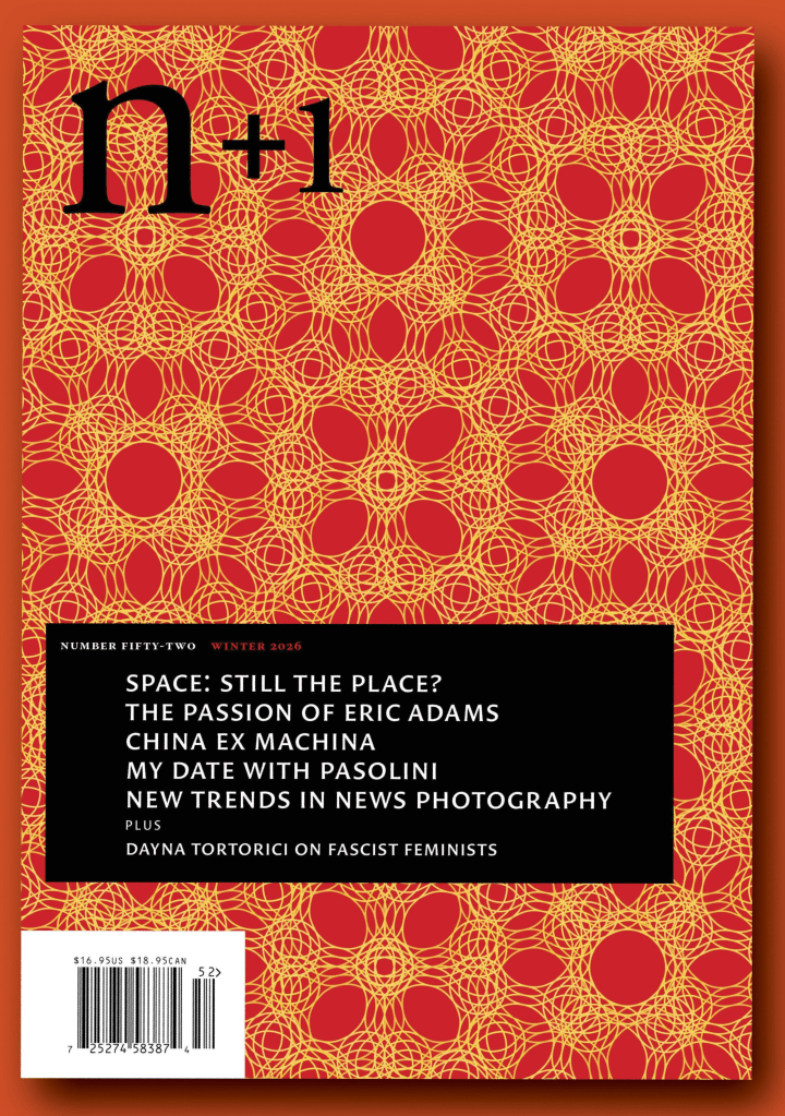 n+1 Magazine: The latest issue features the ‘Winter 2026 issue, CLOSE ENCOUNTERS’ – H is for hawks. Trump’s cleavage: a semiotic investigation. Haters, waiters, trash containers. Emily Callaci and Dayna Tortorici on intra-feminist debates. Matthew Porges on new space odysseys.