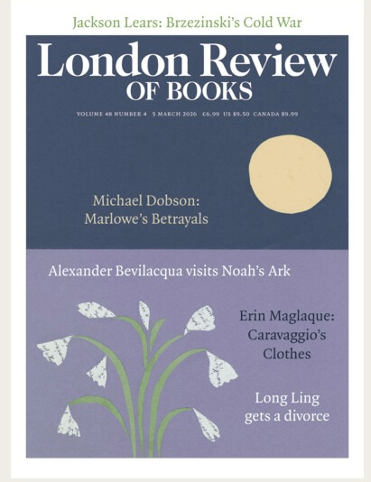 Arts & Literature, Books, Magazines, Opinion, Reviews LONDON REVIEW OF BOOKS – MARCH 5, 2026 PREVIEW February 23, 2026 She Seeks Serene Leave a comment LONDON REVIEW OF BOOKS: The latest issue features Jackson Lears – Brzezinski’s Cold War; Marlowe’s Betrayals; Alexander Bevilacqua visits Noah’s Ark; Caravaggio’s Clothes and more. Lee Gillette, Neil Blackshaw, Ed Jesudason, Samuel Freeman, David Foglesong, Jim Holt, Michael Neill, Malcolm Parry James Butler‘Need a lord on the board?’ Share this: Share on X (Opens in new window) X Share on Facebook (Opens in new window) Facebook Like Loading... Related