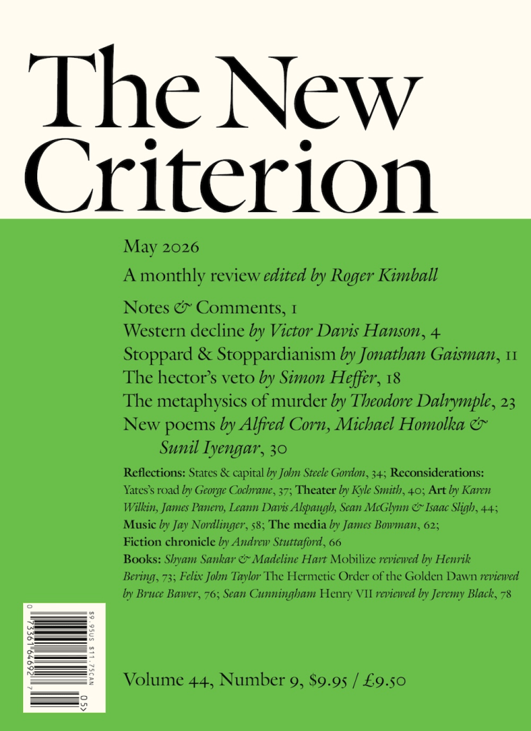 THE NEW CRITERION: The latest issue features ‘ Western Decline’ by Victor Davis Hanson; Stoppard & Stopparianism by Jonathan Gaisman; The hector’s veto by Simon Heffer; The metaphysics of murder by Theodore Dalrypmple and New poems by Alfred Corn, Michael Homolka and Sunil Iyengar…